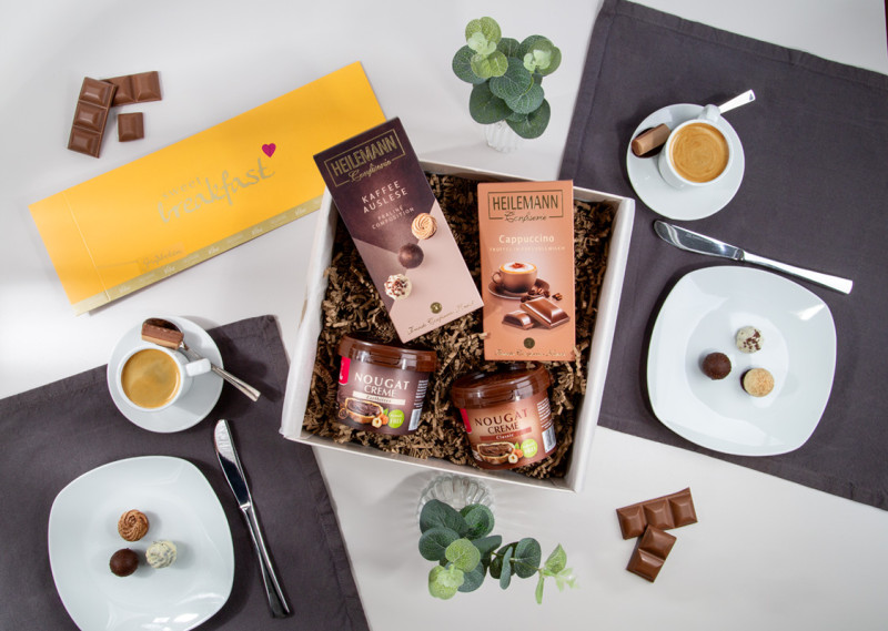 Fein aufeinander abgestimmt präsentieren sich die drei Sorten unserer beliebten Viba Nougat Cremes – Classic, Zartbitter und die neue Nougat Creme Royal im praktischen 375-g-Becher. Ergänzt wird das Set durch die Heilemann Caramel Coffee Schokolade aus der exklusiven Masked Chocolate Range, die edle Tafelschokolade mit Cappuccino-Trüffel-Füllung sowie den zart schmelzenden Viba Genussriegel Café au Lait – ein perfektes Zusammenspiel für alle, die süße Frühstücksmomente lieben.