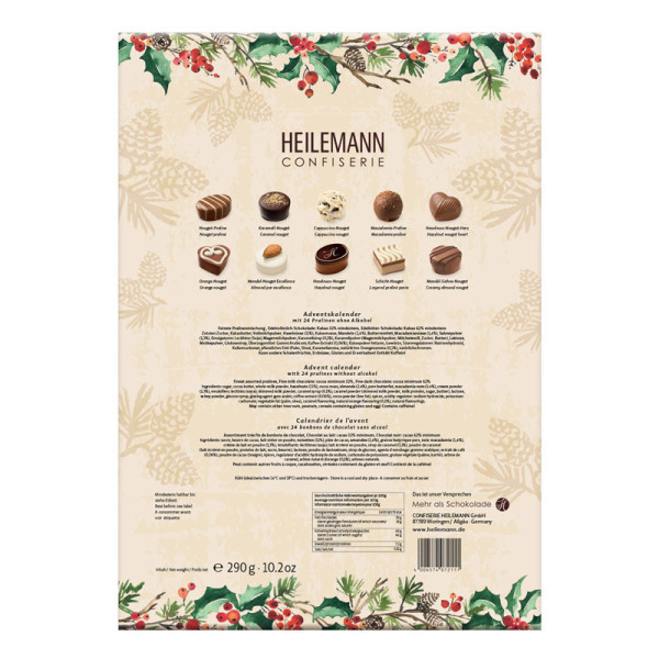 Versüßen Sie sich und Ihrer Familie die Vorweihnachtszeit mit dem Heilemann Pralinen-Adventskalender. Hier kommt das Beste an Weihnachten zusammen: Schokolade und Nougat!