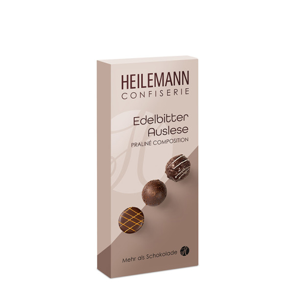 Unsere dunklen Pralinen werden in liebevoller Detailarbeit hergestellt und sind von zartschmelzender Edelbitterschokolade umhüllt. Die Edelbitter Pralinen Komposition bietet Ihnen eine Liaison von herber Schokolade mit feinsten Trüffel-, Marzipan- und Nougatfüllungen. Von Karamell-Nougat, Frucht-Weichkrokant, Mandel-Marzipan, Jamaika Rum-Trüffel, Orange-Bitter-Trüffel, Mokka-Trüffel bis hin zum Kirsch-Trüffel findet jeder Geschmack eine Köstlichkeit. Wir wünschen Ihnen viel Freude beim Genuss. Auch als Geschenk zum Vatertag oder zu anderen Anlässen ist diese hochwertige Pralinen-Schachtel ein Erlebnis für Genießer feinherber Schokoladen-Spezialitäten.