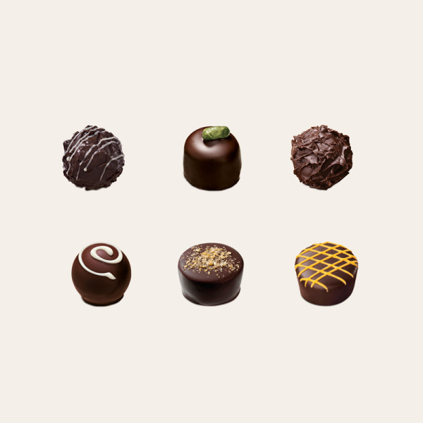Enthalten sind 10 Pralinen in Edelbitter-Schokolade in sechs verschiedenen Sorten: