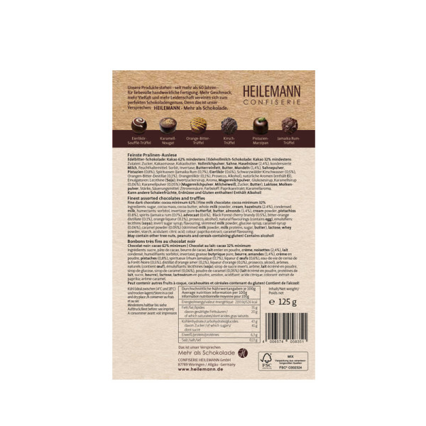 Für alle die die dunkle Seite und ihren bittersüßen Geschmack lieben, ist unsere Edelbitter Pralinen Komposition genau richtig. Eine facettenreiche Auswahl von herben Füllungen umhüllt von feinster Edelbitter-Schokolade: von Jamaika-Rum und Schwarzwälder Kirschwasser bis hin zu Eierlikör ist alles dabei. Ohne Liebe und Leidenschaft würden diese Pralinen nicht dem optischen Anspruch sowie dem Geschmack von HEILEMANN Pralinen entsprechen. Somit ist die Anziehungskraft zu groß, welche den Genießer immer wieder aufs Neue verlockt.