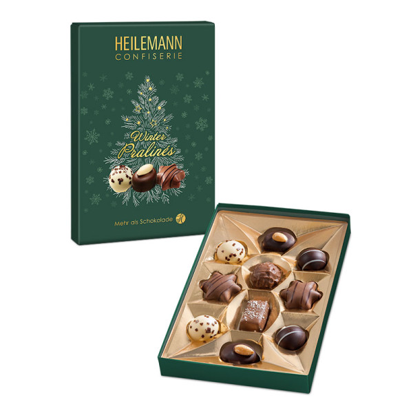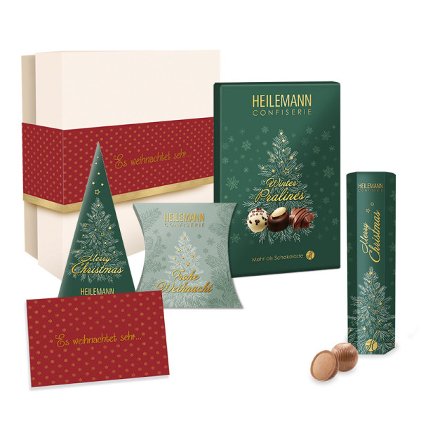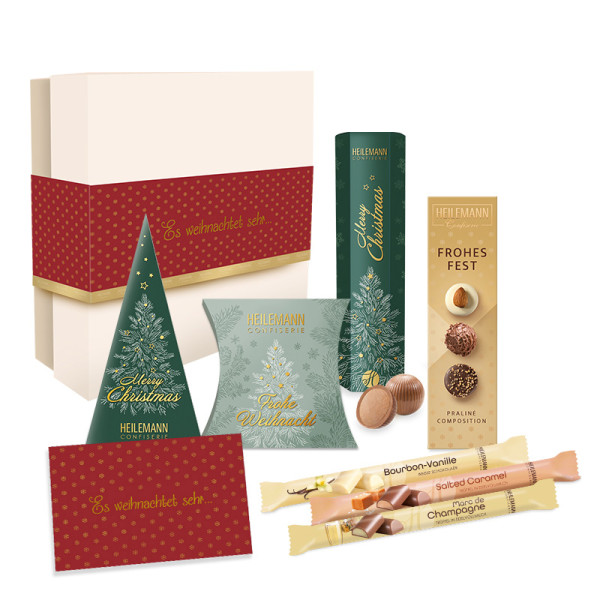 Mit diesem Geschenk verwöhnen Sie Pralinen- und Schokoladenliebhaber gleichermaßen. Exqusite Pralinen und Trüffel gepaart mit feinen Schokoladen als Sticks, gefüllten Kugeln und Drops – eine ausgesprochen vielseitige Komposition. Ein Weihnachtsgeschenk, was sich sehr gut im Kreis der Liebsten an den Festtagen teilen lässt. Diese große Premiumauswahl in der charmanten Geschenkbox mit festlicher Banderole darf unter dem Weihnachtsbaum nicht fehlen. Auf der farblich passenden Grußkarte können Sie liebe Worte an die Beschenkten senden. Schenken mit HEILEMANN macht Freude!