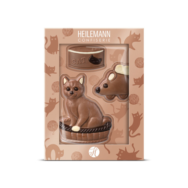 Drei detailreiche Schokoladenmotive aus Edelvollmilch-Schokolade, verziert mit weißer und dunkler Schokolade, greifen die besondere Beziehung zwischen Mensch und Katze auf: eine Katze im Körbchen, eine Dose Katzenfutter und eine Maus. Verspielt, emotional und mit einem Augenzwinkern umgesetzt, entsteht eine kleine Aufmerksamkeit, die sofort ans Herz geht.