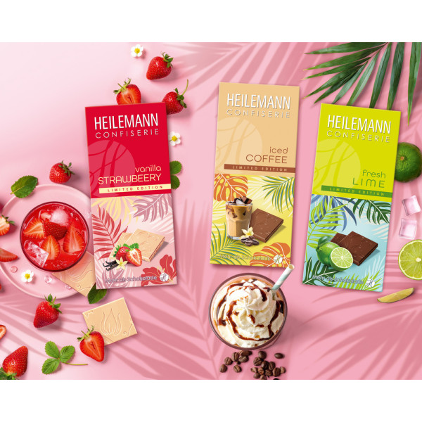 HEILEMANN weckt mit der Summer-Edition die Lust auf Schokoladengenuss im Sommer. Innovativ, frisch und zum Anbeißen lecker – mit den drei limitierten Sommer-Schokoladen ICED COFFEE, vanilla STRAWBERRY und fresh LIME werden nicht nur Liebhaber weißer Schokolade begeistert. Die fruchtig, aromatischen Sorten versprechen sommerliche Leichtigkeit für jeden Schokoladen-Genießer.