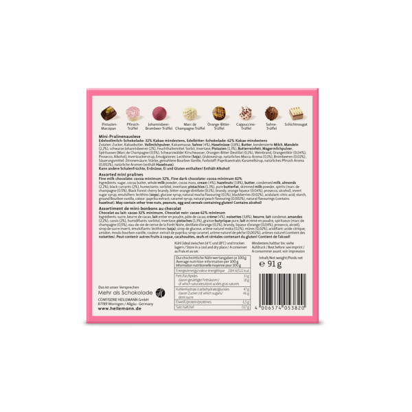 Zutaten: Zucker, Kakaobutter, VOLLMILCHPULVER, Kakaomasse, SAHNE (4%), HASELNÜSSE (3,8%), BUTTER, kondensierte MILCH, MANDELN (2,2%), schwarze Johannisbeeren (2%), Feuchthaltemittel: Sorbit, Invertase; PISTAZIEN (1,3%), BUTTERREINFETT, Spirituosen (Marc de Champagne (0,5%), Orange-Bitter-Destillat (0,1%), Schwarzwälder Kirschwasser, Schwarzwälder Kirschwasser, Weinbrand, Orangenlikör(0,04%), Prosecco, Alkohol), Emulgatoren: Lecithine (SOJA); Invertzuckersirup, Glukosesirup, Säuerungsmittel: Zitronensäure; Brombeeren (0,02%), Farbstoff: Paprikaextrakt; gemahlene Bourbon-Vanille, Stärke, Karamellsirup, natürliches Mocca-Aroma (0,01%), natürliches Pfirsich-Aroma (0,34%), natürliche Aromen, Aroma, Gewürze.