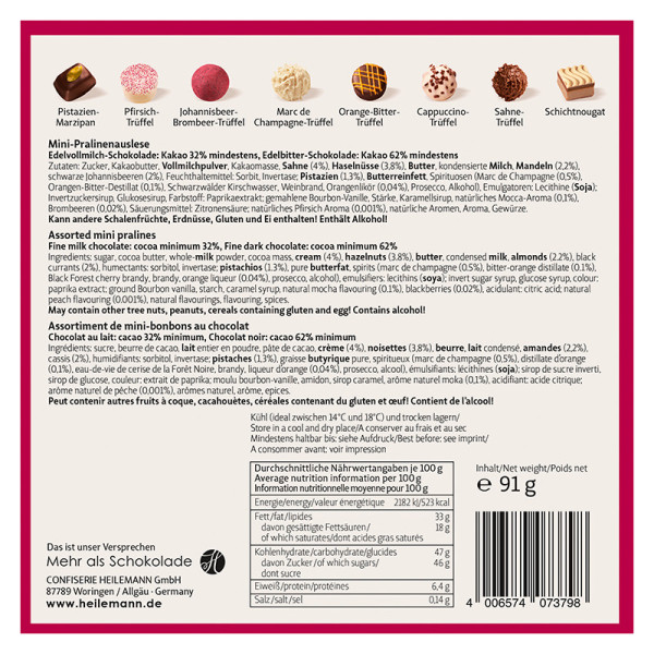 Versüßen Sie sich die kalte Jahreszeit mit den Heilemann Mini Pralinés "Merry Christmas". Die Pralinen-Kreation aus verwöhnt jeden Schokoladenliebhaber. Edelvollmilch- und Edelbitter-Schokolade macht diese Kreation aus fünf handverlesenen Confiserie-Pralinen zu einer süß-herben Genussvielfalt. Die kleinen Pralinen eignen sich besonders als Köstlichkeit zum Kaffee oder als hochwertiges Geschenk zu Weihnachten.