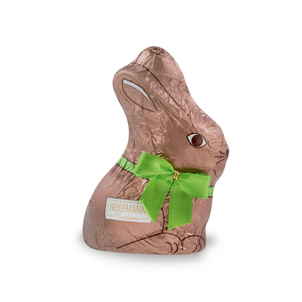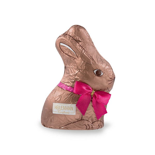 Die dunkle Variante des HEILEMANN Osterhasen für alle Liebhaber von Edelbitter-Schokolade. Wie sein Hasenbruder, trägt auch der braune Schokohase eine echte Stoffschleife um den Hals, die seine besondere Wertigkeit auszeichnet.