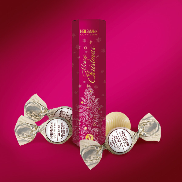 Diese originelle, mit Marc de Champagne-Kugeln gefüllte moderne Geschenkverpackung ist eine tolle Geschenkidee für alle großen und kleinen Naschkatzen. Die mit feinster weißen Schokolade umhüllten und mit prickelnden Marc de Champagne-Kern gefüllten Kugeln sind ein besonderes Geschmackserlebnis, das jeden Genießer dahin schmelzen lässt! Die "Merry Christmas"-Schachtel enthält vier Heilemann Marc de Champagne Kugeln gefüllt mit Marc de Champagne à 15 g.