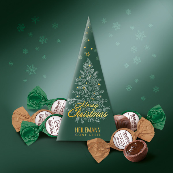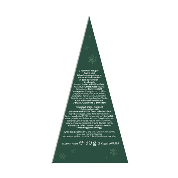 Diese originelle, mit Nougat-Kugeln gefüllte Geschenkverpackung in Form eines Tannenbaums ist eine tolle Geschenkidee für alle großen und kleinen Naschkatzen. Die mit feinster Edelvollmilch-Schokolade umhüllten und mit cremigem Haselnuss-Nougat-Kern gefüllten Kugeln sind ein besonderes Geschmackserlebnis, das jeden Genießer dahin schmelzen lässt! Die "Merry Christmas"-Schachtel enthält sechs Heilemann Nougat Kugeln gefüllt mit feinem Haselnuss-Nougat und Gewürz-Nougat à 15 g.