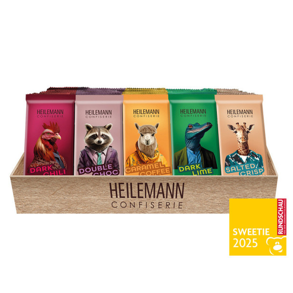 Probieren Sie einzigartige Wechselspiele: ob feinherbe dunkle Schokolade gepaart mit der ausgewogenen Frische fruchtiger Limetten und scharfer Chili oder edle Vollmilch-Schokolade verfeinert mit süßem Karamell, gerösteter Kaffee, salzigen Crisp und Schokoladen Chips. The maskedchocolates offenbaren auch Kennern ein unvergleichliches Geschmackserlebnis. Die tierisch leckereren Schokoladen von HEILEMANN versprechen überraschenden Schokoladengenuss. Je nach Sorte erhält jede Schokolade einen passenden Charakter. So eignen sich die Schokoladen perfekt als kleine Aufmerksamkeit, Geschenk oder Mitbringsel.