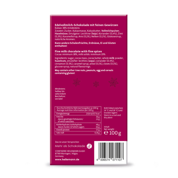 Bei der Heilemann Winter-Schokolade trifft feinste Edelvollmilch-Schokolade auf vertraute Gewürze der Weihnachtszeit. Nelken und Zimt sind es, die den Geschmack von Weihnachten auf der Zunge entfalten lassen. Probieren Sie Stück für Stück diesen Wintertraum, zum Beispiel an einem gemütlichen Abend auf dem Sofa oder vernaschen Sie gemeinsam mit Ihren Freunden, Verwandten oder der ganzen Familie.