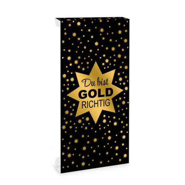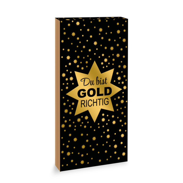 Der Schokoladen-Tafelaufleger mit dem Spruch "Du bist GOLD richtig" eignet sich als Geschenk für Personen, die Ihnen Gold wert sind. Eine liebevolle Botschaft für die oder den Liebste(n), die Oma oder den Opa, die beste Freundin oder den Lieblingskollegen. Ohne große Worte jemanden seine Wertschätzung zeigen, ist eine tolle Geste, die im hektischen Alltag oft zu kurz kommt. Das liebevoll gestaltete und hochwertig, mit Goldelementen gedruckte Cover kann nach Belieben aufbewahrt und wiederverwendet werden. Damit ist es auch ein Beitrag zur Abfallvermeidung und spart zusätzlich Zeit und Arbeit gegenüber dem Einpacken in Geschenkpapier.