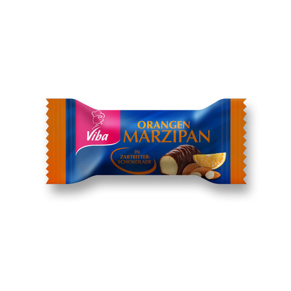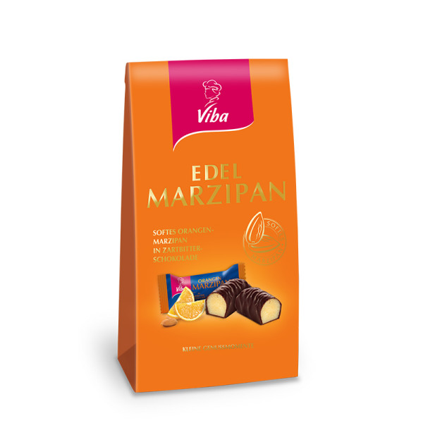 Der Viba Edel Marzipan Orange Beutel beinhaltet 10 Marzipan-Minis à 12,5 g, die Marzipan- und Fruchtgenuss vereinen.