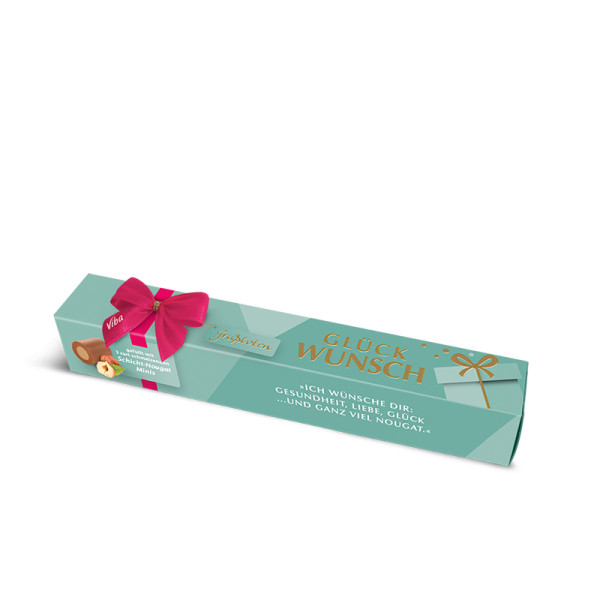 Der Viba Grußbote Glückwunsch sagt „Herzlichen Glückwunsch“ auf die wohl charmanteste Weise: mit feinstem Haselnussnougat und viel Liebe zum Detail. In der eleganten Geschenkverpackung mit hochwertiger Echtschleife warten drei zart schmelzende Schicht-Nougat Minis à 10 g, gefüllt mit einem hellen Haselnussnougatkern. Ein Genussmoment, der beim ersten Bissen überzeugt – cremig, nussig und einfach typisch Viba.