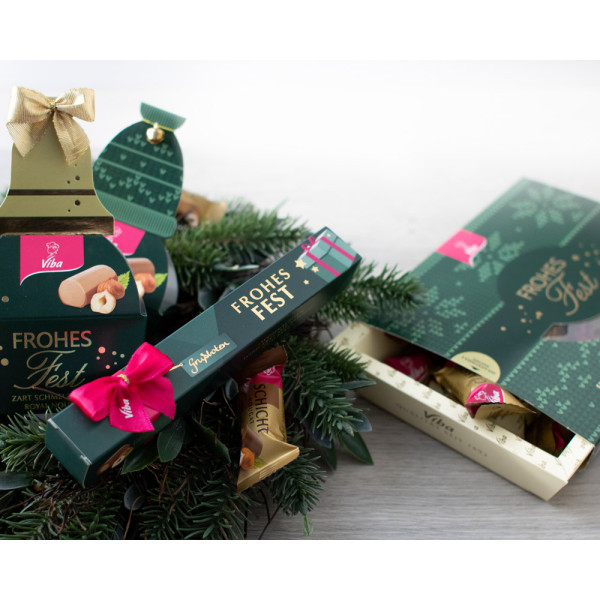 Eine Auswahl an 13 Viba Nougat Minis warten sehnsüchtig in der liebevoll gestalteten Geschenkverpackung "Oh Tannenbaum" entdeckt und genascht zu werden. Für den feinen Genuss in geselliger Runde mit Freunden oder an gemütlichen Winterabenden mit der Familie. Die Verpackung einfach aufschieben, wählen und genießen. Da ist für jeden Geschmack etwas dabei und dazu sieht die Geschenkverpackung mit Goldveredelung auf dem Weihnachtstisch auch noch besonders festlich aus. Zart schmelzender kann man die Weihnachtszeit gemeinsam gar nicht verbringen!